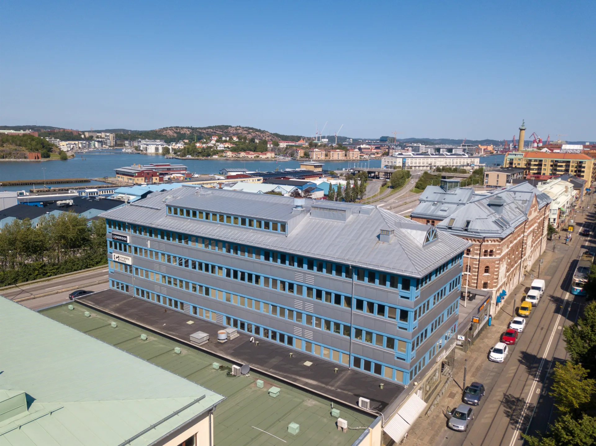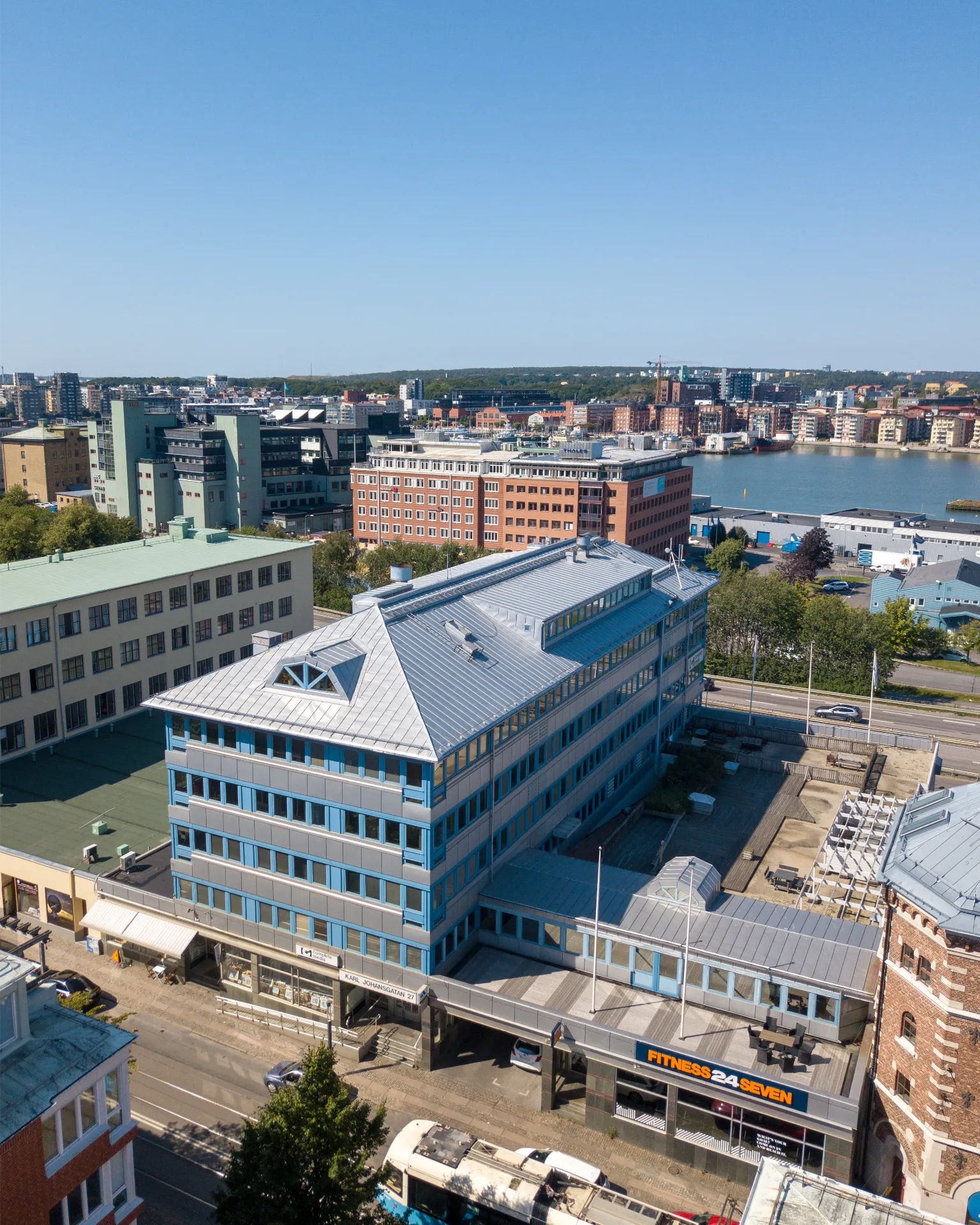 Med härlig utsikt över hamnen ligger här kontorslokaler i fem våningar med butiker och gym i entréplan.